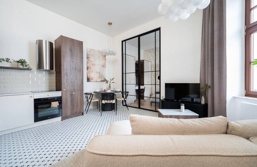This stylish 42m² apartment on the 3rd floor is designed for up to 4 guests, offering a comfortable and convenient stay in the heart of the city. It features two rooms with a queen bed and a sofa bed, a dedicated working desk, and a fully equipped kitchen and bathroom. Enjoy a beautiful city view, fast Wi-Fi, and a Smart TV for your entertainment. The location is ideal, just 550 meters from Piotrkowska Street, 800 meters from Łódzka Mall, and 1.2 km from the nearest train station, with tram and bus stations nearby for easy transport. A complimentary set of toiletries, towels, coffee, and tea is provided to enhance your stay. Self check-in and check-out ensure flexibility, and we issue VAT invoices upon request. Feel free to contact us for more details or to book your stay!