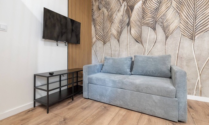 Żwirki i Wigury Apartment #3 is a cozy and practically furnished apartment, featuring a living room with a sofa bed and a kitchenette, a bedroom with a comfortable double bed, and a bathroom. Guests have access to various amenities, including free WiFi, a TV, an iron, a hairdryer, a dishwasher, an oven, a refrigerator with a freezer, an induction stove, and kitchen accessories.