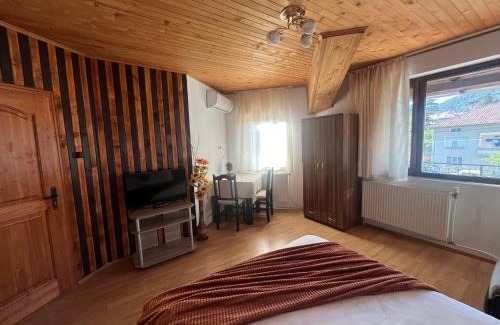 Featuring garden views, Къща Речен шепот in Kalofer features accommodations and a garden. The air-conditioned accommodations are 20 miles from Roman Tomb Hisarya. Guests can enjoy city views. At the guest house, each unit is fitted with a wardrobe, a flat-screen TV, a private bathroom, bed linen, and towels. A terrace with an outdoor dining area and mountain views is offered in select units. The rooms are equipped with heating facilities. Ekopateka Byala Reka is 4.8 miles from the guest house, while Botev Peak is 20 miles from the property. Plovdiv International Airport is 50 miles away.