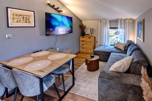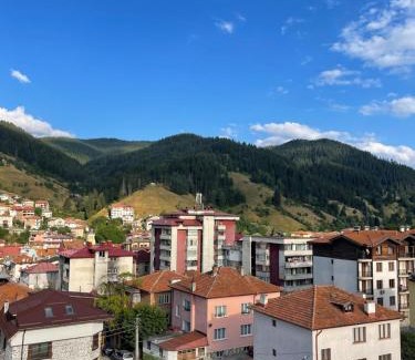 A recently renovated apartment, Мансарда с фантастични гледки и две спални offers accommodations in Chepelare. The air-conditioned accommodation is 27 miles from Bachkovo Monastery, and guests can benefit from private parking available on site and free Wifi. Offering a terrace and mountain views, the apartment includes 2 bedrooms, a living room, satellite flat-screen TV, an equipped kitchen, and 1 bathroom with a shower. Towels and bed linen are offered in the apartment. The property has an outdoor dining area. During the colder months, guests can enjoy winter sports in the surrounding area. Plovdiv International Airport is 36 miles from the property.