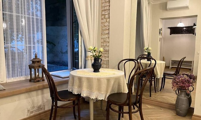 Апартаменти розташовані у тихому дворику де Ви можете запаркувати свою автівку прямо під входом у будинок. Самі аппартаменти розташовані на першому поверсі, мають велике панорамне вікно. Апартаменти вразять Вас оригінальним і приємним дизайном котрий дуже вписується в атмосферу старого міста. Також квартира оснащенна кондиціонером, автономним опаленням, теплою підлогою, бойлером, пральною машиною з режимом сушки, праска, фен, мікрохвильовка, холодильник, посудомийна машина, єлектрочайник, індукційна піч.
