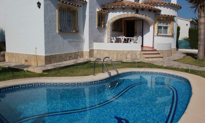Rental villa in Denia (Costa Blanca) This beautiful villa with private pool is situated aprox. 1,5km. from the sandy beach, 700 m from a peble beach, 1,5km. from the supermarkets, restaurants and the town Els Poblets and 9km. from Denia. With capacity for 6 people. The photos are generalized since we have several villas in the same area. The villa consists of private pool with metal stairs, lawn around the swimming pool, terrace with garden furniture...inside with lounge dining room with t.v. (satellite), kitchen, 3 bedrooms and 2 bathrooms, one with shower and the other one with bathtub.