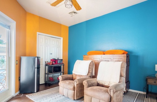 Cozy bedroom w/ recliners and queen Murphy bed. Gorgeous bathroom, standup shower w/ seat. Kitchenette w/ fridge and freezer, toaster oven and coffee maker! Patio golf course views. Private, no shared spaces, except right at the exterior entrance. You will see in the pictures, this unit uses the left hand door, unit A uses the right hand door. Completely separate doors, with locked doors between units.