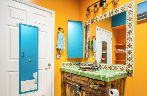 The bathroom is generous sized, continuing the southwest decorating style that you found in the bedroom. A walk-in shower, with bench, as well as a decorative sink and cabinet add to the vacation feel. We provide bath towels, hand towels, and washcloths, as well as soap, shampoo and conditioner in individual packages.