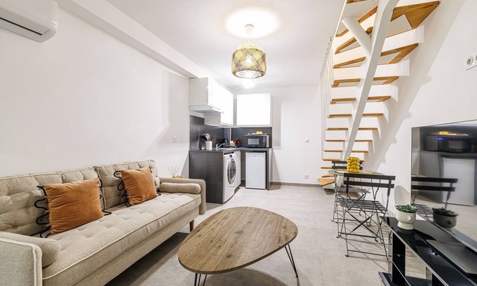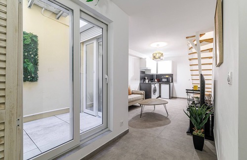 A 31 m2 one bedroom with AC ideally located close to Garibaldi Square, Jean Médecin Avenue with all the shops and the Old Town of Nice.SpaceWelcome to our Downtown Apartment,Located on the ground floor, you will find all the comforts: proximity to touristic places, A/C, equipped kitchen, washing machine, terrace, Wi-Fi... This apartment consists in a bedroom with a comfortable double bed upstairs, bathroom with shower, kitchen open on the living room.Kitchen is fully equipped: fridge, hotplates, microwave, washing machine, coffee machine and kettle. AccessThe apartment is fully equipped. Bed linens and bathroom towels are provided, and you will have access to the complete accommodation.InteractionBnb Groom Services’ team is glad to greet you in Nice.Keys will be given to you in our office, Bnb Groom Services. We can also organize a check in on site depending on your arrival time and our availability. Don't hesitate to share you arrival information as soon as you have it.We will be there to advise you before and during your stay, available by phone or by email to answer any questions and make sure you spend a great stay at your home away from home.NeighborhoodGaribaldi Square and Avenue Jean Médecin are popular and lively areas of Nice. This situation offers you the opportunity to do all your food shopping by walking, as well as a multitude of restaurants and many shops… and of course beaches and the Promenade des Anglais at 15 minutes on foot. Walk along Garibaldi Square and you will arrive at the entrance of the Old Town and its famous flower market. Everything is on your doorstep to fully enjoy your stay in Nice. TransitAccess to accommodation from the airport is possible by tram: take the line n°2 in direction of Port Lympia and stop at Durandy. Journey takes only 25 minutes and this stop is 200m away from the apartment. You can also ask us to arrange a private car transfer from the airport to the apartment.Train station « Nice Ville » is 15 minutes away on foot, allowing you to discover Antibes, Cannes, Grasse, Monaco, Menton or even to go in Italy easily.Access to the building is also possible by car. You can park in the public Parking Marshall, only 5 minutes away by walking.IMPORTANT - RULES OF PROCEDURE :For security reasons, before arrival an online check-in should be completed via our Yaago application in which the person in charge of the booking should provide identity document.The accommodation should be returned in a suitable state of use, respecting the premises, the neighborhood, as well as basic rules of cleanliness and hygiene.Parties and noisy evening gatherings are not allowed.Smoking isn’t allowed inside.Non-compliance with these instructions may result in a deduction from the deposit or cancellation of the stay.Thanking you in advance for your kind collaboration.