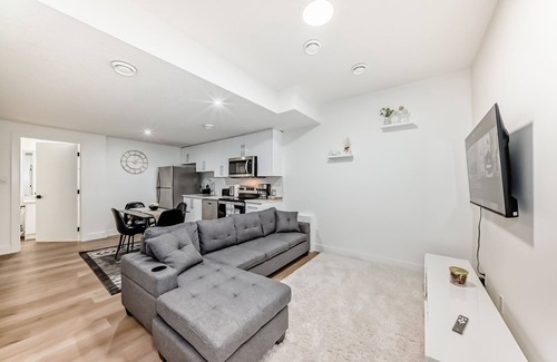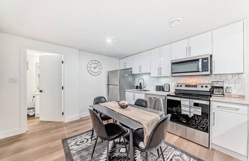 Imagine arriving after exploring Edmonton’s sights just a one- to two-minute drive off the Anthony Henday onto a peaceful, tree-lined street. Step inside to a bright, open living area with plush seating and a fully stocked modern kitchen featuring stainless-steel appliances and a central island. A dining table for four is perfect for quick breakfasts or evening board games.