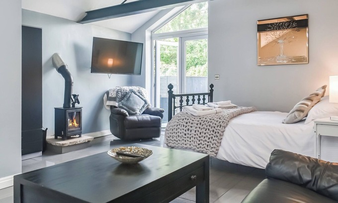 Shower Room: Cubicle Shower, Heated Towel Rail, Toilet. Electric central heating, electricity, bed linen, towels, Wi-Fi and fuel for wood burner included. Welcome pack and doggy extras. Enclosed back garden with patio and garden furniture. On road parking. No smoking.. Tucked away in a beautifully converted garage, this stylish studio-style holiday let is the perfect countryside escape for couples, and one well-behaved furry friend.