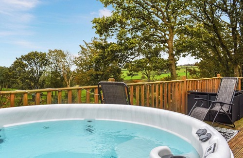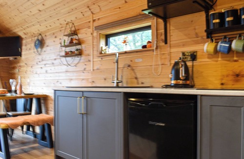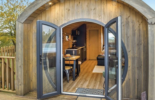 Shower Room: Cubicle Shower, Heated Towel Rail, Toilet. Electric central heating, electricity, bed linen, towels and Wi-Fi included. Travel cot and highchair. Welcome pack. Back garden with firepit, sitting-out area, garden furniture and barbecue (Gas). Grounds with sitting-out area and garden furniture. Children’s play area (shared with other properties on-site). Hot tub for 4 (private). Private parking for 1 car. No smoking.. Machlud Haul is a charming, cosy pod nestled within 115 acres of beautiful farmland. This peaceful retreat offers an intimate escape, perfect for couples and families seeking relaxation and connection with nature. The pod is equipped with all the essentials for a comfortable stay. One of the standout features is your private hot tub, where you can unwind and soak under the stars while taking in the tranquil surroundings of the rolling countryside.