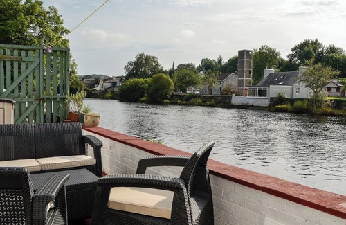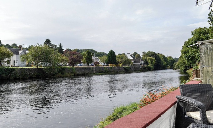 Shower Room: Cubicle Shower, Heated Towel Rail, Toilet. Electric central heating (solar panels), electricity, bed linen, towels and Wi-Fi included. Logs for wood burner available locally. . Courtyard with sitting-out area and garden furniture. Private parking for 1 car. No smoking. Please note: There is an unfecned river in the garden, 10 yards away.. Surrounded by similar cottages in Old Minnigaff, on the edge of Newton Stewart, this cosy, character filled, terraced riverbank cottage is located in a quiet courtyard. It is just a short stroll from the property to all the local amenities including pubs, restaurants and shops. The garden is set right on the riverbank and is perfect for spending endless hours watching the local wildlife, including kingfishers and otters, or just enjoying a glass of wine as the sun sets over the river. The wood burner in the living room and huge picture window means that even when it is raining you can still enjoy the outlook over the River Cree.