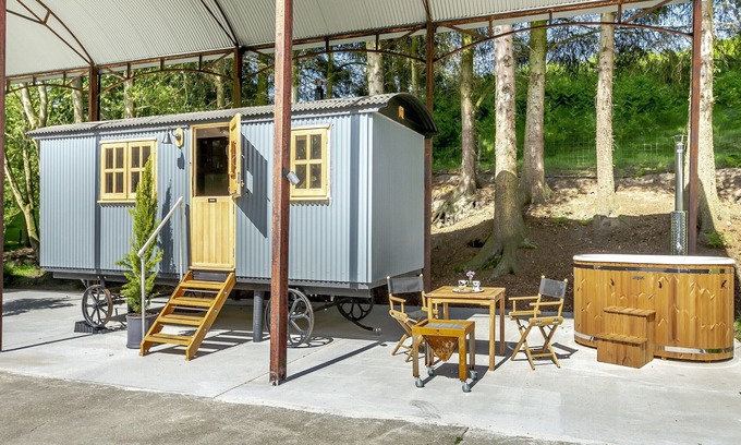 Shower room: With shower cubicle, toilet and heated towel rail.. Electric central heating, electricity, bed linen and towels included. Welcome pack. Grounds with sitting-out area, garden furniture and barbecue/firepit. Wood-fired hot tub (private). 1 small dog welcome, to be kept on a lead at all times (sheep country). Bike Store. Private parking for 1 car. No smoking. Please note: There is a stream in the grounds. . ’Clarabel’ is one of two luxury Plankbridge Lodge shepherd’s huts found within the beautiful North York Moors National Park; a designated Dark Sky Reserve, one of only a handful in the world! Midway between the towns of Helmsley and Thirsk, these lodges are perfect for two people looking for a romantic or active break surrounded by some of the UK’s most stunning scenery.