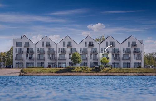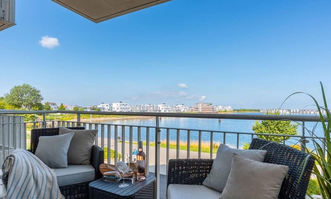 Baltic Sea holidays in a modern holiday apartment in the first row to the water. Furnished to a high standard and stylishly furnished in a maritime country house style, the Küstenwind holiday apartment boasts an exclusive location directly on the harbour promenade of the OstseeResort Olpenitz. Flooded with light with floor-to-ceiling windows and a phenomenal view over the sailing and sports boat harbour, this holiday apartment offers complete holiday luxury. The view falls on the floating houses and the Baltic Sea fjord Schlei with passing sailing ships and the Schleimünde lighthouse. Harbour cinema is guaranteed, as are the picture-perfect sunsets that can be watched from the balcony.
