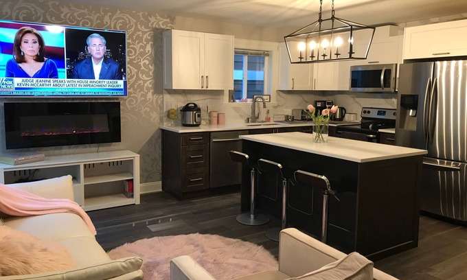 Situated in Bear Mountain - resort style living. Brand new BEAUTIFUL MODERN PARIS CHIC 1bedroom suite with quartz countertops in kitchen/bathroom, fireplace, 65 inch tv, chandelier in bedroom, brand new bathroom with new tile, faucets and tub. Private entrance and covered patio with patio furniture overlooking a relaxing greenbelt. Includes: hair dryer, dishes, pots, pans, cutlery, toaster, and coffee maker. Washer / dryer uses cold water wash. These accommodations suite 3 people, 2 in bedroom and one on couch. There is NO sofa bed. There are 4 steps to get into this suite of which 3 are on the walkway and one is the porch step (see photos).