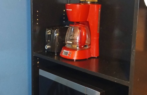 KITCHENETTE: * double sink * coffee maker * toaster * multi-function microwave-air fryer-convection-oven (works really well!) * new fridge * matching dishes, silverware, cookware, glasses, etc., small table, breakfast nook, see pics.
