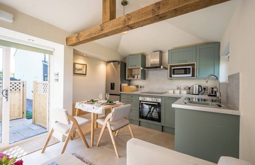 You’re welcomed into the charming open plan living space with some exposed beams, a two-seater sofa, table, and chairs, should you wish to dine in, and a double bed. The kitchen is fully equipped with an electric hob and oven, microwave, free-standing full-size fridge / freezer, small integrated dishwasher, washing machine / dryer, toaster, and kettle. With glazed doors and windows looking out to the countryside, this is a lovely light and airy space. There is underfloor heating throughout the property making it lovely and cosy in the cooler months.