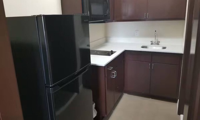 ✦ Your room is 325 sq. ft, equipped with complimentary toiletries, kitchen with basic amenities, 43-inch TV, available with Premium cable, ensuring cleanliness and comfort throughout your stay.