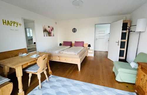 New bed made of pine wood, very comfortable with a new, large mattress (180 cm)!Charming 1-room-apartment with private entrance. Located on the ground floor of our new house. Very quiet place, in perfect order with tasteful furniture. You will sleep in a double bed (180x190), have a seperated small but fully equipped kitchen with cooking accessories, Nespresso coffee machine, fridge and ceramic stove. Enjoy the bright bathroom with shower and relax in the morning sun at your private little terrace equipped with two outdoor chairs. The apartment features a beautiful oiled oak floor and minergie comfort ventilation. You can darken the room with electric shutters. Color TV with a wide range of channels.Internet available via WiFi. It's the perfect hub for a great holiday on the countryside with short connection to Lucerne. Numerous places of excursions and a wonderful environment invite you to experience Central Switzerland. Only 7 mins walking distance to Eschenbach's train station (from train station to house you have to walk uphill!), closest motorway access 10 mins. Train S9 is plying twice per hour to Lucerne (12 mins travel time) or to the next swimming pond (Baldeggersee - 20mins travel time). If you fancy jogging or walking: beautiful forests will welcome you within short distance. Eschenbach has about 3500 inhabitants and features several supermarkets, a bakery and a pizzeria-restaurant. The apartment is designed for two people. Parents travelling with a baby or toddler are also very welcome. Free parking. Non smoking flat.Laudry service is available against extra charge.