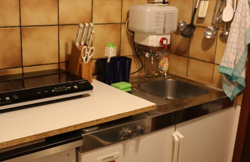 If used by one person, the fold-away bed can be folded up to create a very spacious living room. Beautiful lamps and comfortable armchairs with new cushions allow you to make yourself comfortable in the evenings. Roller shutters allow you to completely darken the apartment during the day and ensure a restful sleep.