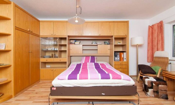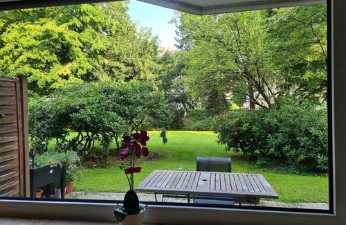 The 40 sqm one-room apartment with kitchen, hallway, and bathroom is located at the rear of the garden on a quiet side street. There is absolutely no traffic noise, and you can enjoy the peace and quiet and the beautiful view of a park-like garden from the terrace. There is a double bed (a fold-away bed with a comfort topper and a new mattress measuring 1.60 m wide) and a sofa bed with a high-quality innerspring mattress (1 m wide), suitable for extended use.