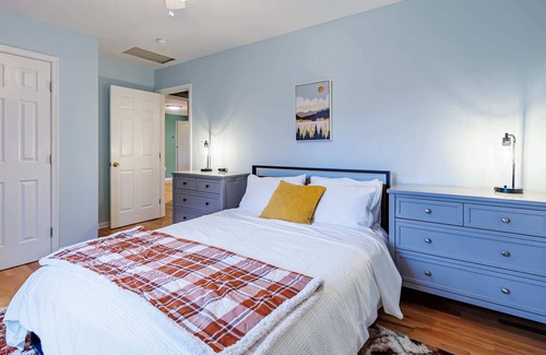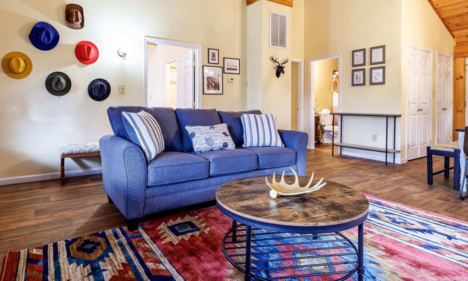 The second cabin boasts an inviting eat-in kitchen with a dining table for 6. Cook to your heart's content using the fully equipped kitchen, featuring a dishwasher, oven, stove, microwave, and toaster. The kitchen flows into the main living area, where you'll find a SmartTV, sleeper sofa, and comfortable chairs. All three bedrooms are located on the main level, offering a King bed in the first bedroom with an ensuite bathroom, two bunk beds in the second bedroom (sleeping four), and a cozy full-size bed in the third bedroom. Additionally, there are two and a half baths, including a full tub, a full shower, and a convenient half bathroom.