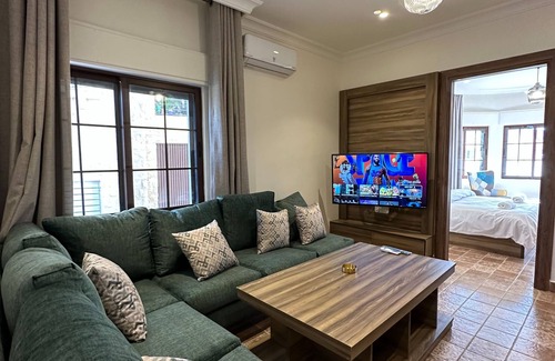 Experience the best of Jordanian hospitality in this stunning apartment, perfectly located in the heart of Amman. This entire apartment is available for rent, offering a comfortable and private space for travelers and locals alike. The apartment boasts a spacious layout, featuring a cozy living room and a TV room, perfect for unwinding after a long day.
