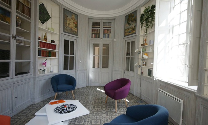- Salon / library oval, 20 m2, flagship piece on the ground in old cement tiles, its Provençal paintings,