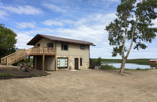 Just freshly renovated, this lovely Lakeside Gallery and Guest house is located right along Highway 5 on the way to Waterton National Park and is now ready for you and your family for 250.00 Canadian dollars per night for up to 4 persons and 20.00 per additional person per night. It is situated on a little farm and is right on the shore of a beautiful little lake. It is located just outside Waterton Park . There is so much to do for you and your family right here at The Lakeside Gallery. In our Hitching Post, we have weaving and spinning demonstrations and our guests also have the opportunity to weave their very own rug. Also for your enjoyment we have a farm animal petting tour with bunnies, kitties, goats, ponies and horses. New this year we are offering our "introduction to horses" program where we give rides in our arena. Our trained staff gives kids and adults a fun opportunity to learn a little about horses and then have rides while we lead the horse. We also offer wagon rides at night and paddle boats are there for fun on the little lake. So there really is a lot to do here at the Lakeside Gallery & Guest House. It can be rented by itself or in conjunction with our next door property The Hayloft which accommodates 25. (VRBO 722581) Another wonderful feature is the The Lakeside Gallery and Guest House can sleep up to 12 people with seven beds and a futon. Kitchen is fully furnished with everything you need. Bedding and towels are also provided. Our living room has wonderful seating for your large group as well. There is a nice little deck and a fantastic view of Chief Mountain. We have another development out in our farmer's field for camping spots if you need to park an RV trailer. The perfect group facility for summer fun, eating, boating, camping, hayrides and enjoyment of our farm animals. We would love to have you and your family here.