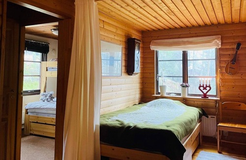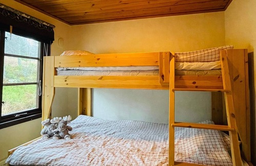 Welcome to a peaceful accommodation with a lake view in beautiful Värmskog. Lake Vermeln glitters below the house. You can easily walk there in just 5 minutes and if you take a car, you will be there in just under 2 minutes. The accommodation is located in a quiet cottage area. The accommodation is spacious, good for 2 families with children, the larger group or a comfortable stay with the family. The large cabin consists of an open kitchen with seating for many. In the main cabin there is a toilet which is connected to the hall. Adjacent is a fully tiled room with a laundry/tumble dryer and a shower cubicle. The house is homely with a warm feeling with elements from Swedish 70s style. The kitchen has most of what you could need with a modern stove, dishwasher and fridge with freezer. There is a large terrace with a view of the lake and also a grill for good summer dinners. The living room has a fireplace and comfortable sofas with TV. In this house there is a large bedroom with a double bed 180 cm wide. Further into the house is a smaller bedroom with a bunk bed 80/120 and next to it a sleeping alcove with a single bed 120 cm wide. The guest house is to the left of the house. There is also a nice outdoor shower between the houses. The guest house is smartly planned. To the right is an entrance with a room with a bunk bed 80/120. To the left is the larger room with its own entrance. Here is a double bed 180 cm, a single bed 105 cm. A total of 5 people can live in the guest house. Directly between these rooms with their own entrances is storage and a toilet with sink. The parking lot outside is large with nice lighting in the evenings. A very practical accommodation that welcomes and invites the extended family. A perfect accommodation for those of you who want peace, proximity to several nice bathing spots and beautiful nature. There is a large selection of lakes and fishing opportunities for those interested here in Värmskog. In order to fish, you must buy a fishing license for the intended lake and follow the rules that apply to the selected lake. Great hiking trails such as the Silverleden and Kycklingeden in Grums are also recommended, which are suitable for children. A visit to Värmskogs Café is a must. Large shrimp sandwiches are served here, where people make pilgrimages for their good food. You will have a good time here. Welcome.