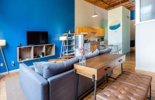 *Important Note: This rental is located in a historic tobacco warehouse that has been converted into residential apartments but still maintains older warehouse fixtures. The walls for the bedrooms do not reach the 22 foot ceiling, this can be seen in the pictures. Also, since this is an industrial setting, some noise does carry from surrounding neighbors. The parking is not on the ground level of the building, but rather 1 block away. Let us know if you have any further questions about these notes!