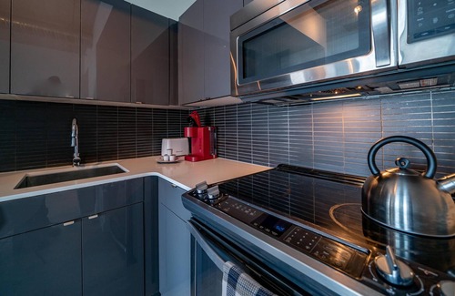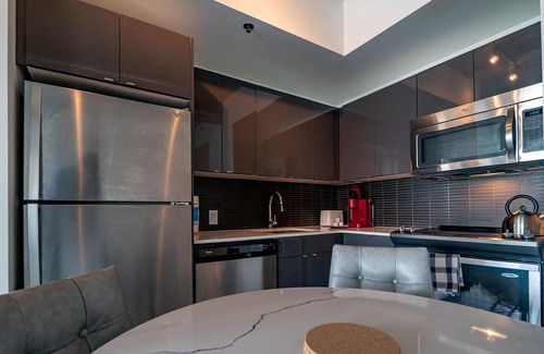 1 bedroom, 1 bathroom, a Smart TV set up to enjoy Netflix(bring your credentials!), and complimentary WiFi. The kitchen is equipped with stainless steel appliances, quartz countertops and completely stocked with cookware to prepare your favourite meal - just bring your own ingredients!