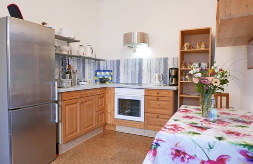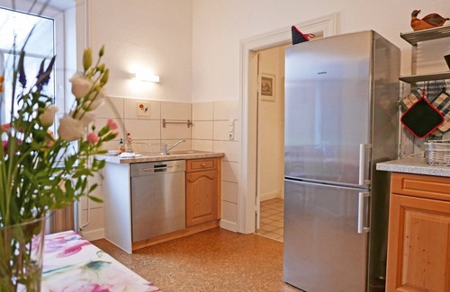 For up to 4 people, the beautiful country house apartment offers comfortable furnishings on approximately 110 m² and a large garden with a beautiful view of the countryside. The bright rooms and tasteful furniture create a pleasant atmosphere of wellbeing. The living room is spacious, offers comfortable seating and a cozy reading corner with its own small holiday library - flat-screen TV, DVD player, music system and free WiFi provide entertainment. The historic stove in the living area offers a special visual highlight, even if it unfortunately cannot be fired. Nevertheless, you do not have to freeze in colder weather and can make yourself really comfortable in front of the crackling, modern fireplace in the threshing floor. In addition, of course, the apartment also has central heating.