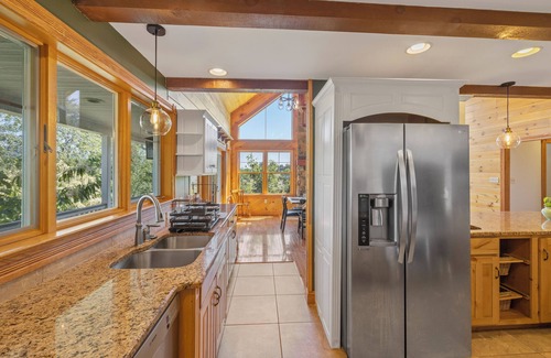 → kitchen/dining room with attached cafe room complete with kitchenware, a large dining table, access to the back deck, plenty of cabinet space, a large fridge and even an old restored church bench. FUN!!