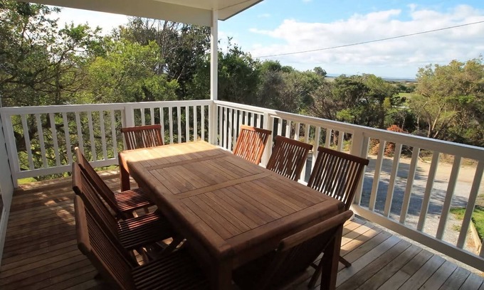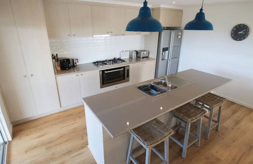 Upstairs, the spacious open plan living/dining/kitchen space makes the most of the stunning views. There is a flat screen TV, DVD player, RC/AC and a feature wood heater. The modern kitchen features a dishwasher and large fridge with ice dispenser. There is a coffee machine with milk frother - please bring Lavazza Modo Mio pods.There's dining space for 7 guests inside, with outdoor dining for 7 and a stainless steel BBQ on the large front deck as well.