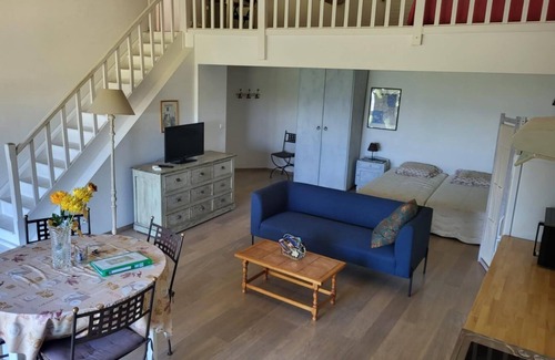 Loft style gîte (56 sq.m.) on upper floor, adjoining owner's 1883 manor house. Large, light & airy room with sleeping alcove (double bed), lounge, fitted kitchen area. 24 sq.m. picture window with open views of surrounding countryside. Upstairs: shower room/WC, attic mezzanine with cross-beam (2 single beds, desk). Gîte in traditional pebble and packed earth house in quiet, attractive setting including the owner's garden (4,000 sq.m apple trees). Nearby: Pérouges, caves at La Balme, Lyon, the Dombes. Renovated in 2008. Optional cleaning charge: 30€.