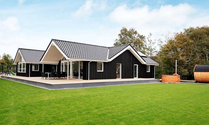 A holiday cottage with a swimming pool located 500 metres from the sea. The pool section has a 19 m2 large swimming pool with a slide for the children to enjoy. Outdoors you will find a bath barrel and a sauna for cosy evenings. The children can play and use the swing and play beach volleyball. There is also a football field. In the activity room you can play billiards and dart, and there is a bar with a refrigerator. The table tennis can be found outdoors. There is PlayStation3 and a DVD-player. The house has modern furnishings with a personal touch. The well-arranged kitchen has a large fridge, freezer cabinet and a dish washer. Enjoy the warmth of the wood-burning stove. The house is suited for the disabled with wide doorways and a ramp leading to the house.