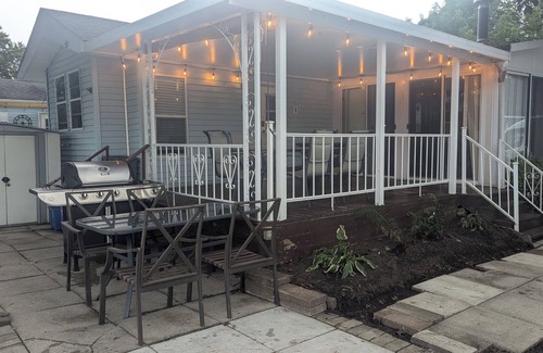 Covered outdoor dining porch, with a BBQ and fire pit.