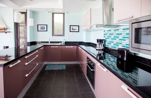The modern design kitchen, which is fully equipped, including a dishwasher and washing machine is open plan, looking onto an airy modern furnished dining room and lounge, boasting its own indoor rock feature. This whole area is able to be opened up for a windowless view of both the garden and pool. The pool area includes a patio set, 2 sun loungers and a gas bbq.