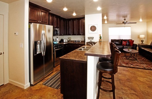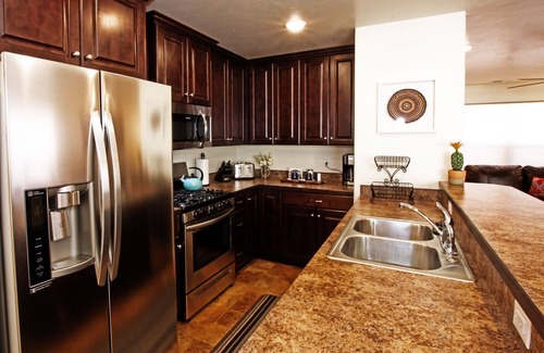 This two-bedroom townhome sleeps 6 (with a queen sofa bed on the main floor) and king beds in the two master suites with private bathrooms. Each bedroom has a TV and in the living room there is an Xbox gaming console! There is also a desk and chair available in the townhome if you need to get some work done during your stay.
