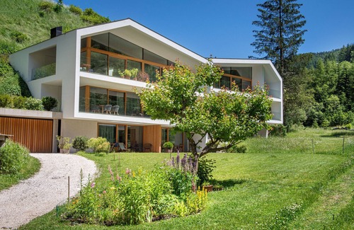 Immersed in the deepest green, this structure was designed by Dr. Arch. Nadia Moroder and completed in 2022. This holiday home nestles perfectly in the surrounding nature and boasts modern and unique lines, designed to amplify the well-being of those who live there.