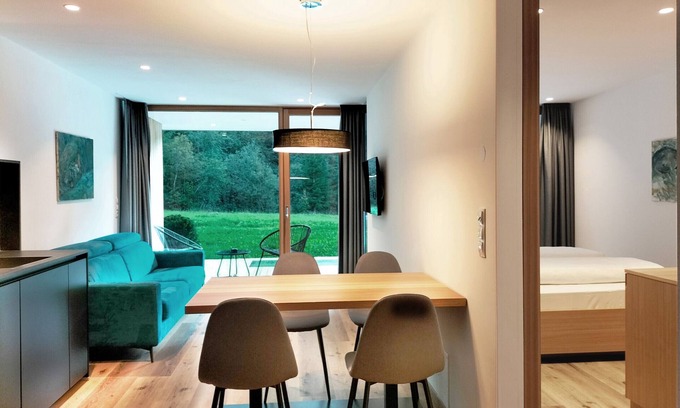 This apartment in the midst of nature was built in 2022 and boasts a high standard of interior and space designed down to the last detail.