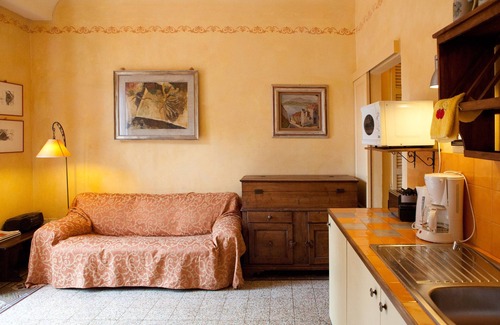 "Maria Apartment" is a two room apartment on the first floor facing the 3000 sqf common terrace of the Villa. It includes one bedroom with a double bed or two twin beds, living room with fold out sofa bed, breakfast nook and completely equipped kitchenette (electric burners, fridge, microwave, coffee machine, moka, kettle, toaster). Independent gas heating, TV, Wi-Fi internet connection, in-house self-service laundry room with 2 washers, 2 dryers and iron.