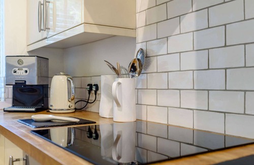 A well-equipped room with beautiful garden views. Amenities include an electric oven with induction hob, integrated fridge/freezer, washing machine, dishwasher, microwave, wine cooler, kettle, coffee percolator, toaster, two-seater leather sofa, wooden dining table with seating for four, stereo and a small selection of DVDs