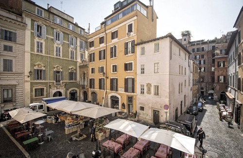 The building is located in a small piazza where there is a picturesque food an flowers market; a lovely patch of colour in the heart of the city. Very close to the Pantheon and Piazza Navona; Spanish Steps and the Trevi Fountain are just a short walk away. It is the ideal place from where to start your journey through Rome and get lost in its small alleys. This neighbourhood is the home to the main monuments and historical places of the capital and the most famous shopping streets, via del Corso, via di Campo Marzio , via Condotti etc.