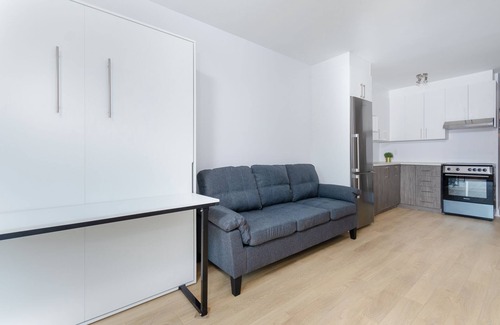 Lovely furnished studio in Hochelaga. This unit is well furnished and has all that you need to live and work comfortably at home. The unit is well renovated, it includes a gourmet kitchen, a living room, a bathroom, hardwood floors, washer & dryer in the building, a private balconies and a rooftop terrace! This apartment is walking distance from parks, grocery store, drugstores, convenience stores, metro Pie-IX on the green line, Olympic Stadium and all amenities that you may need.