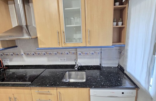 La cocina independiente, de vitrocerámica, está completamente equipada con nevera, microondas, horno, congelador, lavavajillas, cafetera, tostadora, hervidor de agua y exprimidor, todo lo necesario para que te sientas como en casa.