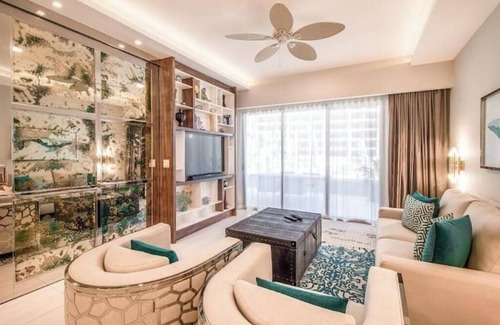 During your stay, you’ll have exclusive access to the entire 1-bedroom suite, featuring 1,313 square feet (121 m²) of thoughtfully designed space inspired by marine life. The contemporary interior blends rich textures and calming tones to create a relaxing and luxurious atmosphere. Upon entering, you’ll find a gourmet kitchen with high-end appliances, a dining area for four, and a spacious living room with a 55-inch flat-screen TV, a sofa bed, and coral-inspired armchairs. A full guest bathroom, along with a washer and dryer, are conveniently located just off the kitchen.