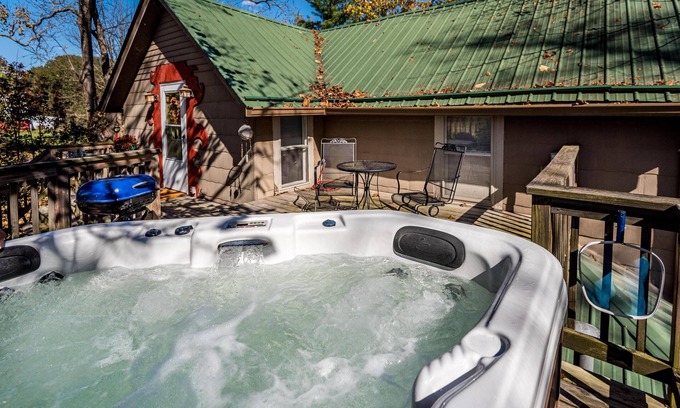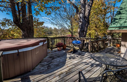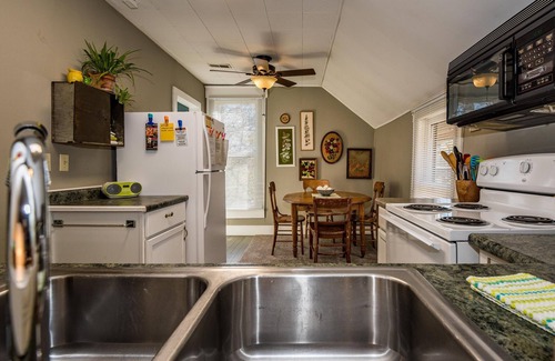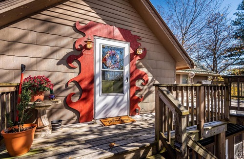 Climb the stairs to find a nice deck with a hot tub overlooking Brown County's famous tree-covered hills (with a gorgeous view of the sunset sky), and table & chairs perfect for bird watching while you sip your morning coffee. From the deck you'll be able to see the Indiana Railroad train, as it goes through the little village of Helmsburg. When you step inside the front door, an airy and open space that's bright, comfortable, and clean awaits. All the rooms are spacious and decorated with vintage and up-cycled finds, as well as local art. Two cute sofas, a 40-inch flat screen TV, and a chair make for the perfect spot to snuggle, read, or watch a movie. High-speed internet, Roku, and the full Sling package provide endless options for TV watching. There are also books, games, a DVD player, a Wii video game console, and stereo for the times you may want to hunker down and stay in, cuddled up with lots of soft, cozy blankets.