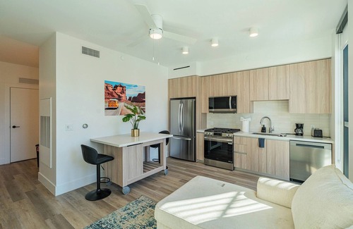Modern comfort meets city vibes! Stay in this chic 1BR/1BA nestled in Downtown Phoenix. Enjoy the 1st-floor market, pet spa, rooftop kitchen, and TWO pools, one with skyline views! Relax in the sauna, hit the gym, or grill and chill under the Arizona sun. Your perfect Phoenix escape awaits!