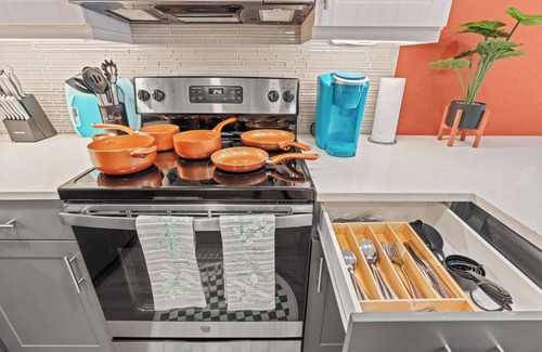 The kitchen is equipped with plenty of cooking appliances and spacious countertops for your convenience.