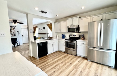 The Extra Mile Retreat 🏡 is a cozy floor plan with 2 BR/1 BA located in a quiet neighborhood on a cul de sac. There are several amenities, including cooking 🍳 essentials, a 12 Cup Coffee ☕️ Maker with coffee essentials, bath essentials, Smart TVs 📺 in living room and bedrooms, a work space, and washer/dryer.