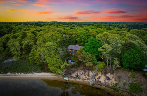 **Perched over sparkling Waquoit Bay, this stylishly renovated waterfront home features a 38’ LR/DR open plan with large picture windows for watching boats, wildlife, and extraordinary sunsets. Entertain while cooking for the whole family in the large luxury kitchen surrounded by barstool seating. Walk down private stairs to the bay to swim, fish, paddle board, or kayak. Enjoy magnificent sunsets while grilling, sitting around the fire pit or enjoying the hot tub.**